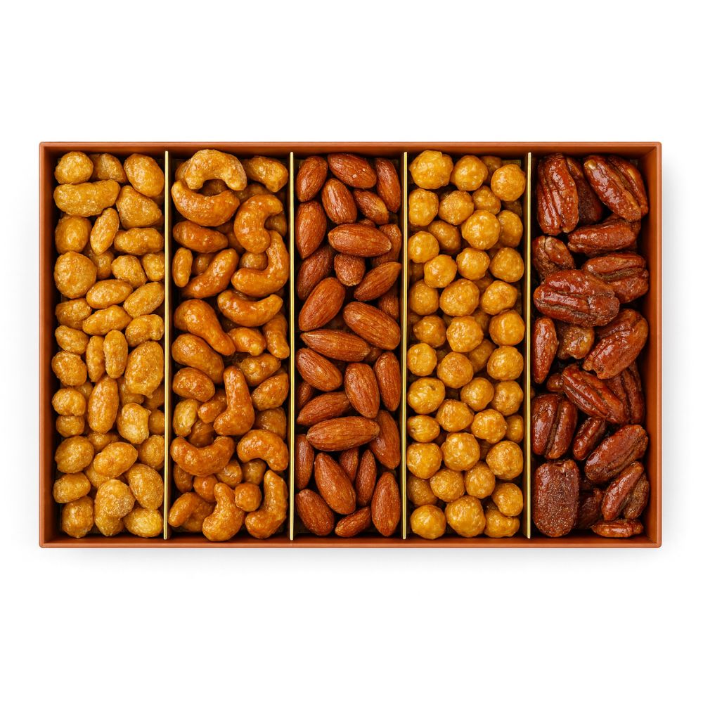 A delightful blend of honey cashews, almonds, peanuts, hazelnut and pecans, our gift box provides a premium selection of sweet nuts. An indulgent surprise for any occasion, this mix offers a delightful crunch and a delightful mix of flavours.